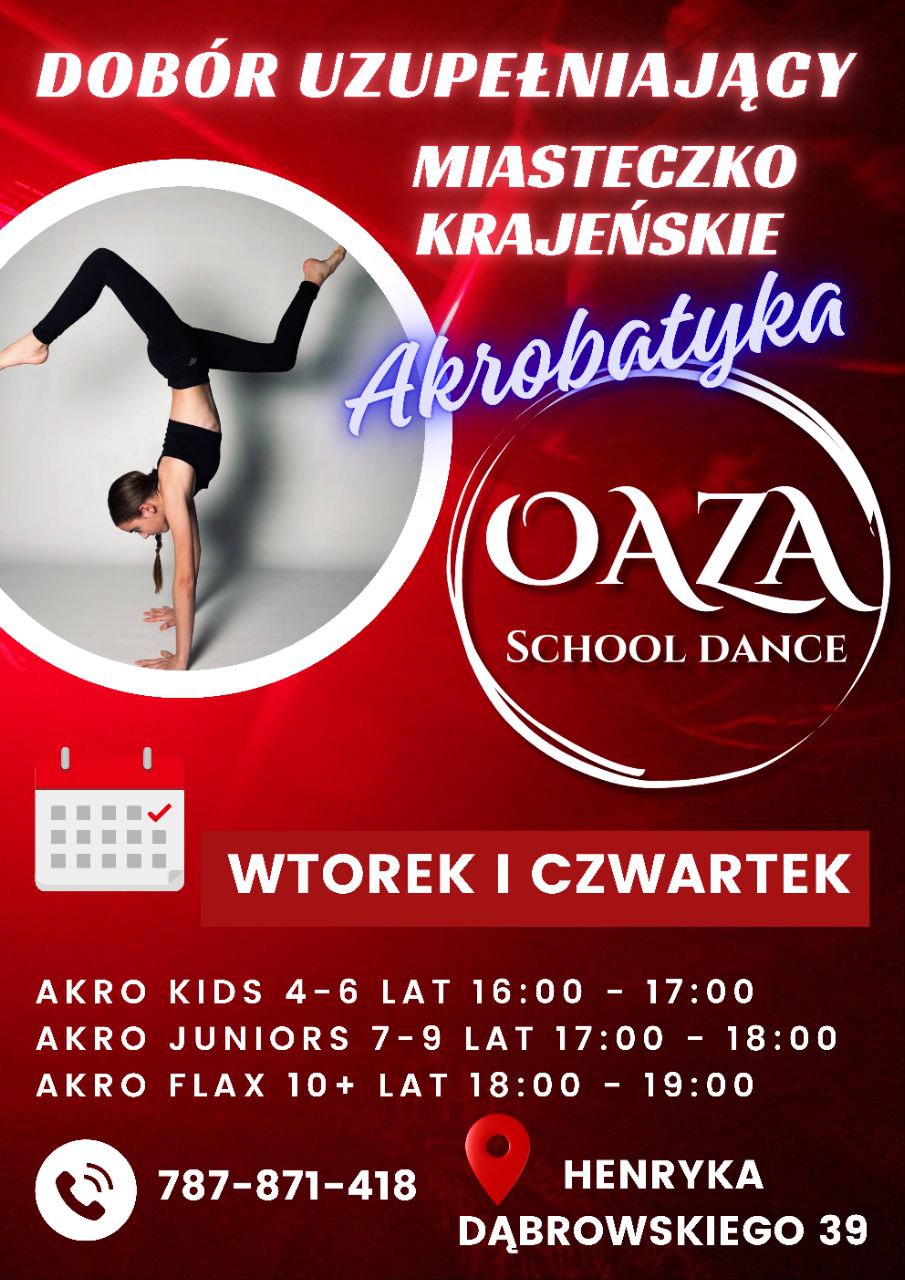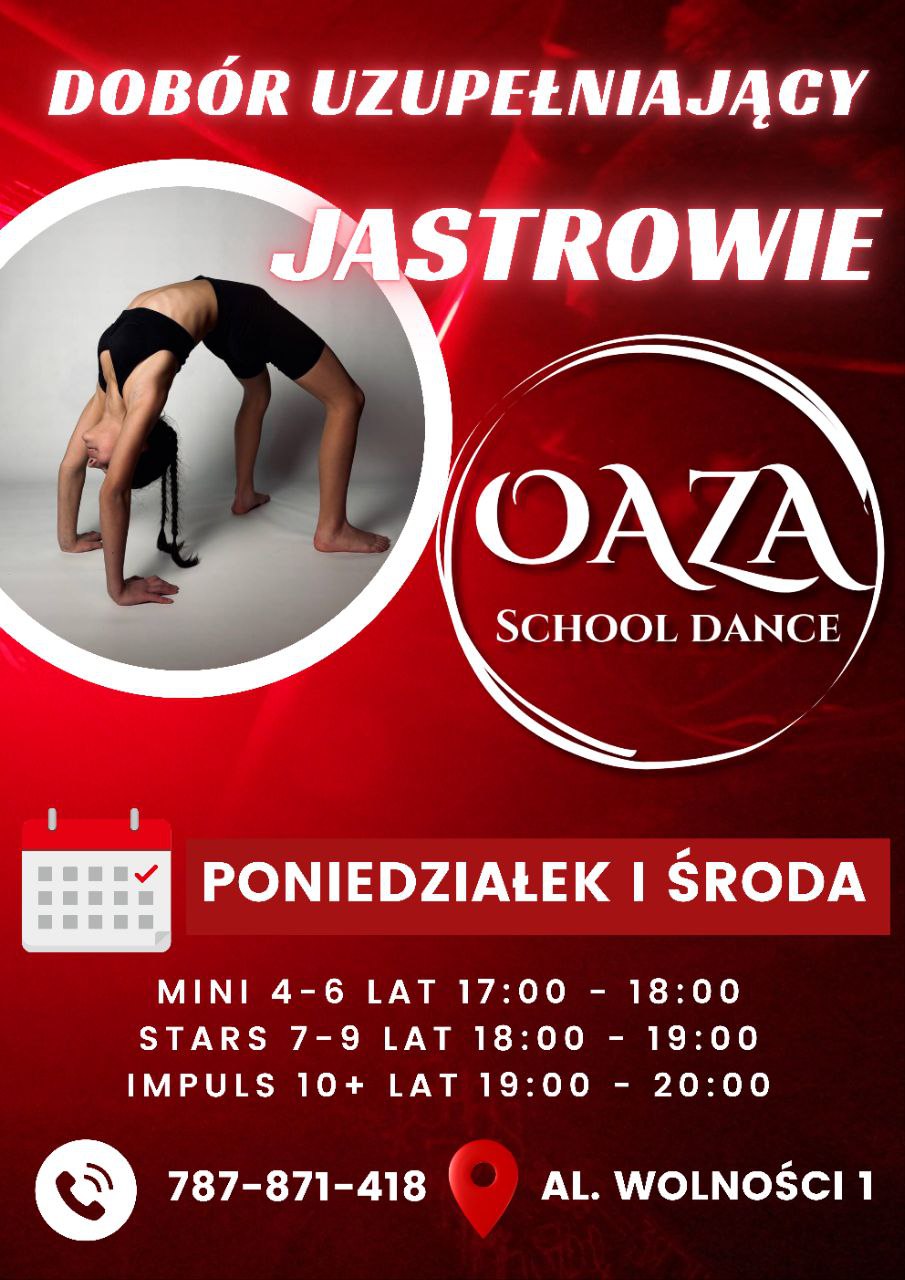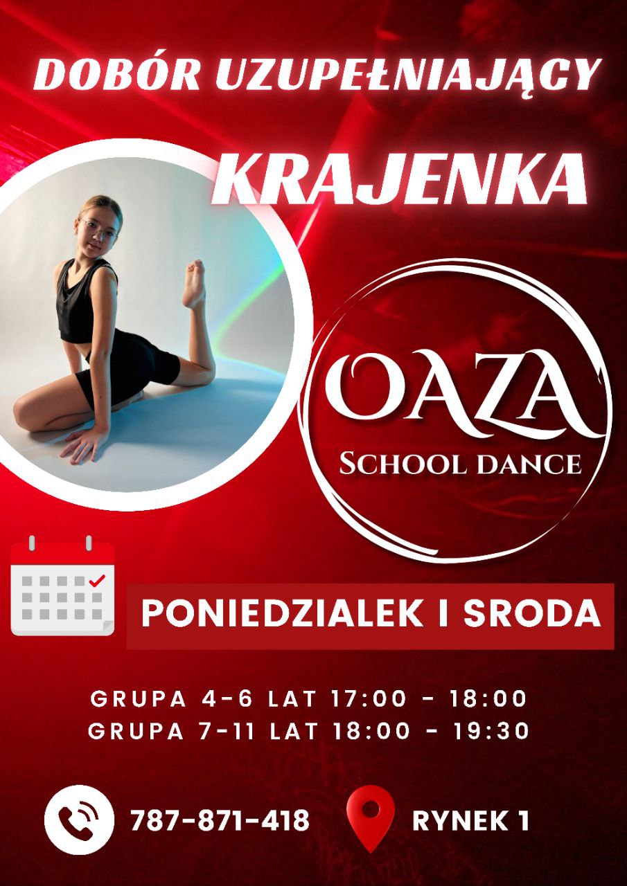 Szkoła Tańca OAZA powstała z miłości i pasji do tańca jej właścicieli – Michała i Poliny Potapov. Są to dyplomowani tancerze z Charkowa na Ukrainie. Zajęcia prowadzone są w dwóch kierunkach: taniec współczesny (dance mix, modern, contemporary) oraz akrobatyka (akrobatyka podstawowa).
