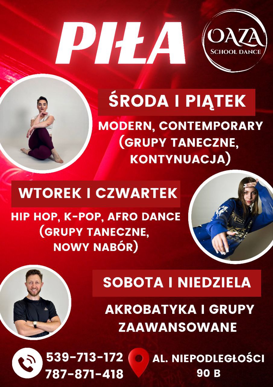 Młoda i ambitna kadra trenerska skupia się na utrzymaniu wysokiego poziomu tanecznego, a także na zapewnieniu bezpiecznej i komfortowej przestrzeni dla dzieci. OAZA posiada 8 lokalizacji i działa na terenie powiatów pilskiego i złotowskiego